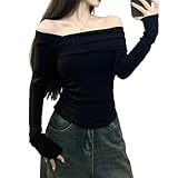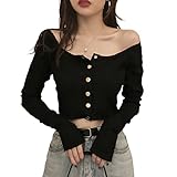 [優億] オフショルダー 長袖 tシャツ レディース ショート丈 カットソー トップス 肩だし セクシー 着痩せ 無地 肩見せ かわいい 一字襟 春秋 韓国ファッション (肩見せ ブラック)